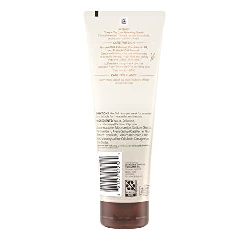 Details: Aveeno Tone + Texture Renewing Body Scrub gently exfoliates dull surface layers to smooth bumpy, rough skin. The body scrub from a dermatologist-recommended skin care brand for over 70 years reveals more even skin tone in just one week and is suitable for sensitive skin. Formulated with prebiotic oat to nourish skin, the gentle, fragrance-free body scrub containing 2% natural PHA exfoliant gently cleanses and renews to smooth bumpy, rough skin and visibly improves uneven skin tone. Designed to exfoliate and renew for smoother, more even skin, the exfoliating body scrub is fragrance-free as well as soap-, sulfate-, paraben-, and dye-free. To use, squeeze the body scrub onto a wet washcloth or hands, work into a rich, creamy lather, and rinse. For results, use 3-4 times per week