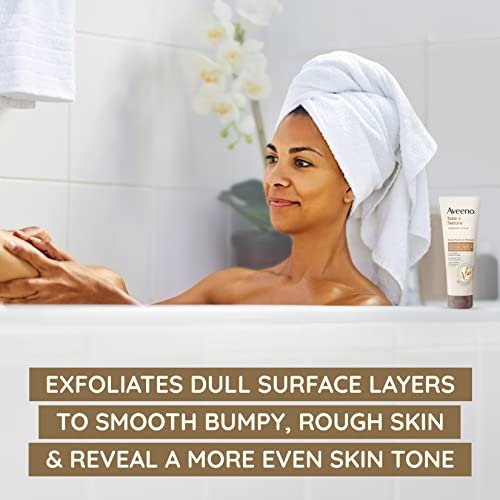 • 8-ounce tube of Aveeno Tone + Texture Renewing Body Scrub gently exfoliates dull surface layers to smooth bumpy, rough skin and reveal a more even skin tone in just one week