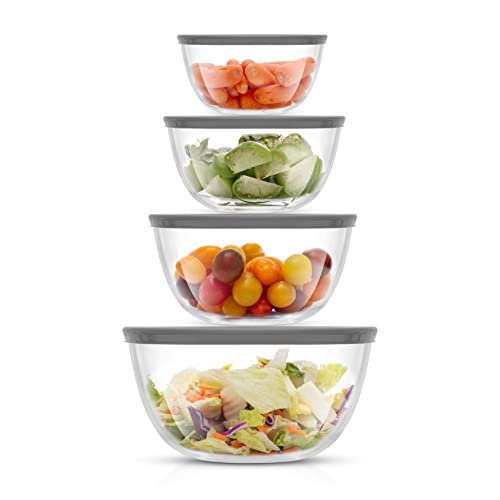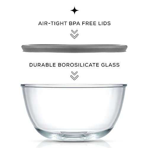 • Durable Bowls That Nest With Ease: When it comes to glass mixing bowls you want them sturdy thick clear and space saving right? If so you’ll probably love these four thick strong mixing bowls with lids They neatly nest for easy compact storage and tough enough for life! Cook for Joy by JoyJolt.