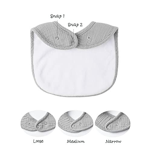 - SOFT and ABSORBENT: The front of baby bibs are made of 100% cotton(Muslin) and the back are polyester(comfort fleece) for maximum absorption with skin-friendly soft touch. The bib soaks up all drools and spits to keep you and your baby clean and dry, no more wet clothes!