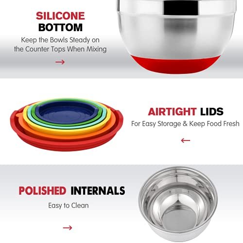 • 🍜[MULTIFUNCTION & EASY CLEAN] Steel bowls are prefect to mix, toss salads, stir, whip, knead dough, marinate and store. Ideal present for New home, Easter, Thanksgiving Day, Christmas or any occasion. Simple to clean by hand and dishwasher safe. Please hand-wash the lids to minimize exposure to heat.