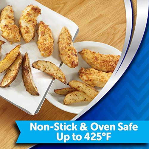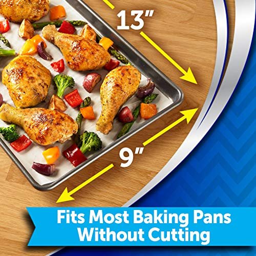 - Reynolds precut parchment paper for baking has a nonstick surface that helps baked food, such as egg rolls and chicken tenders, slide right off your pan